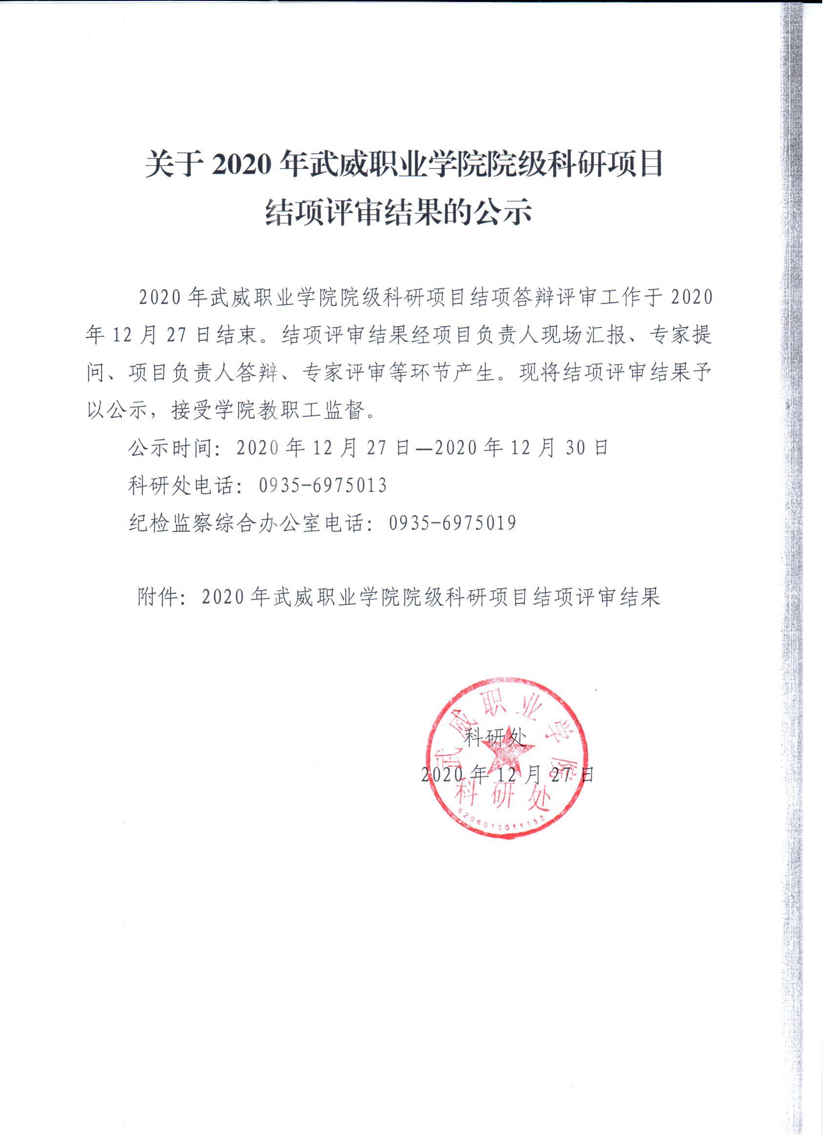 關于2020年武威職業(yè)學院院級科研項目結項評審結果公示
