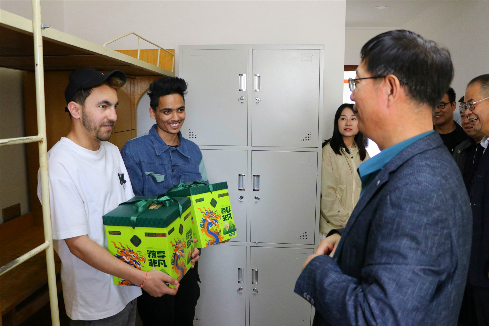 端午將至,為更好開展留學(xué)生教育管理工作,使我校來華留學(xué)生更好地認(rèn)識和體驗(yàn)中國傳統(tǒng)節(jié)日文化,5月30日,學(xué)校黨委副書記、副校長張開禮,黨委副書記翟存祥,黨委委員、副校長王守云一行與國際合作交流處全體工作人員走進(jìn)留學(xué)生公寓,給留學(xué)生們送去節(jié)日的關(guān)懷和溫暖。