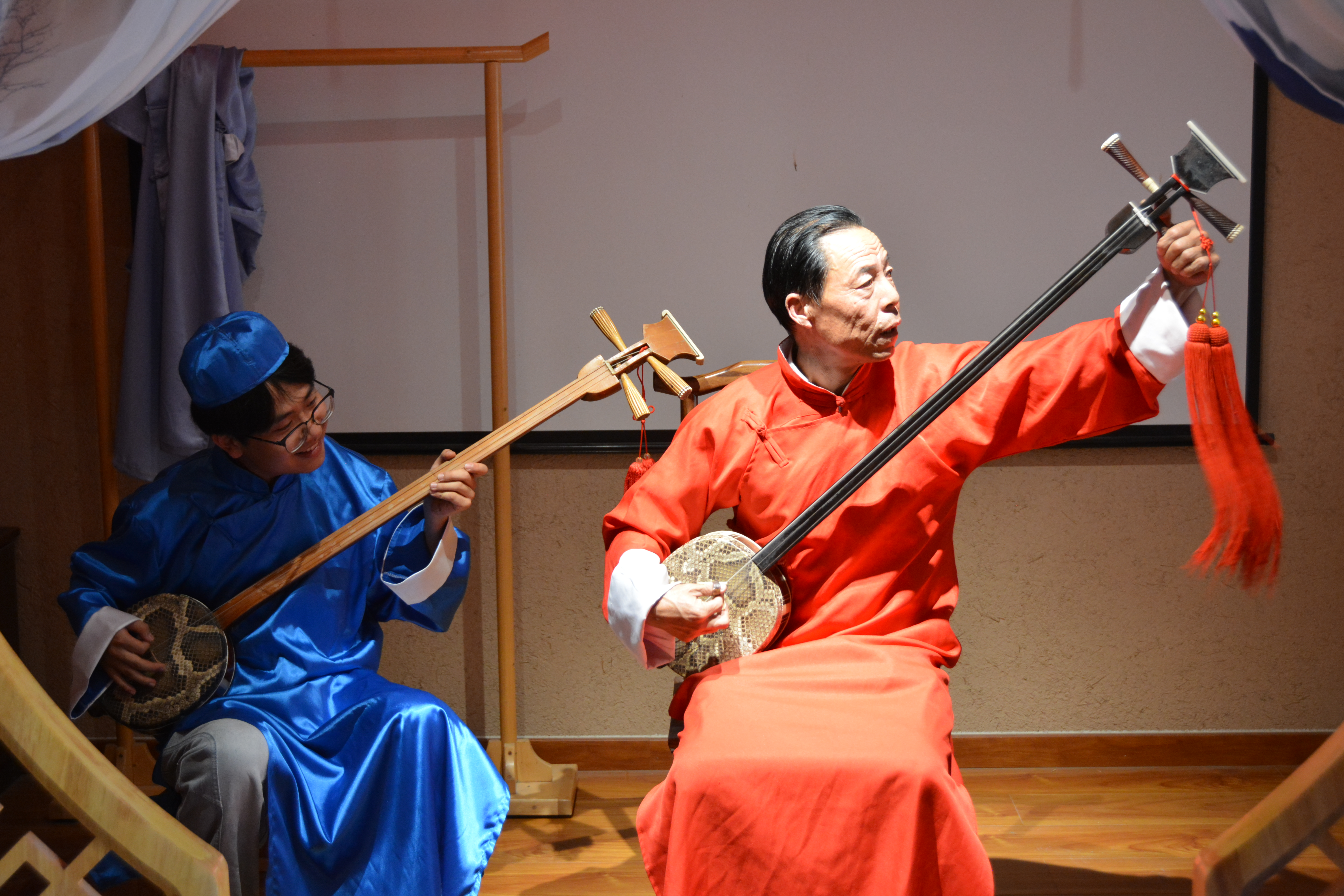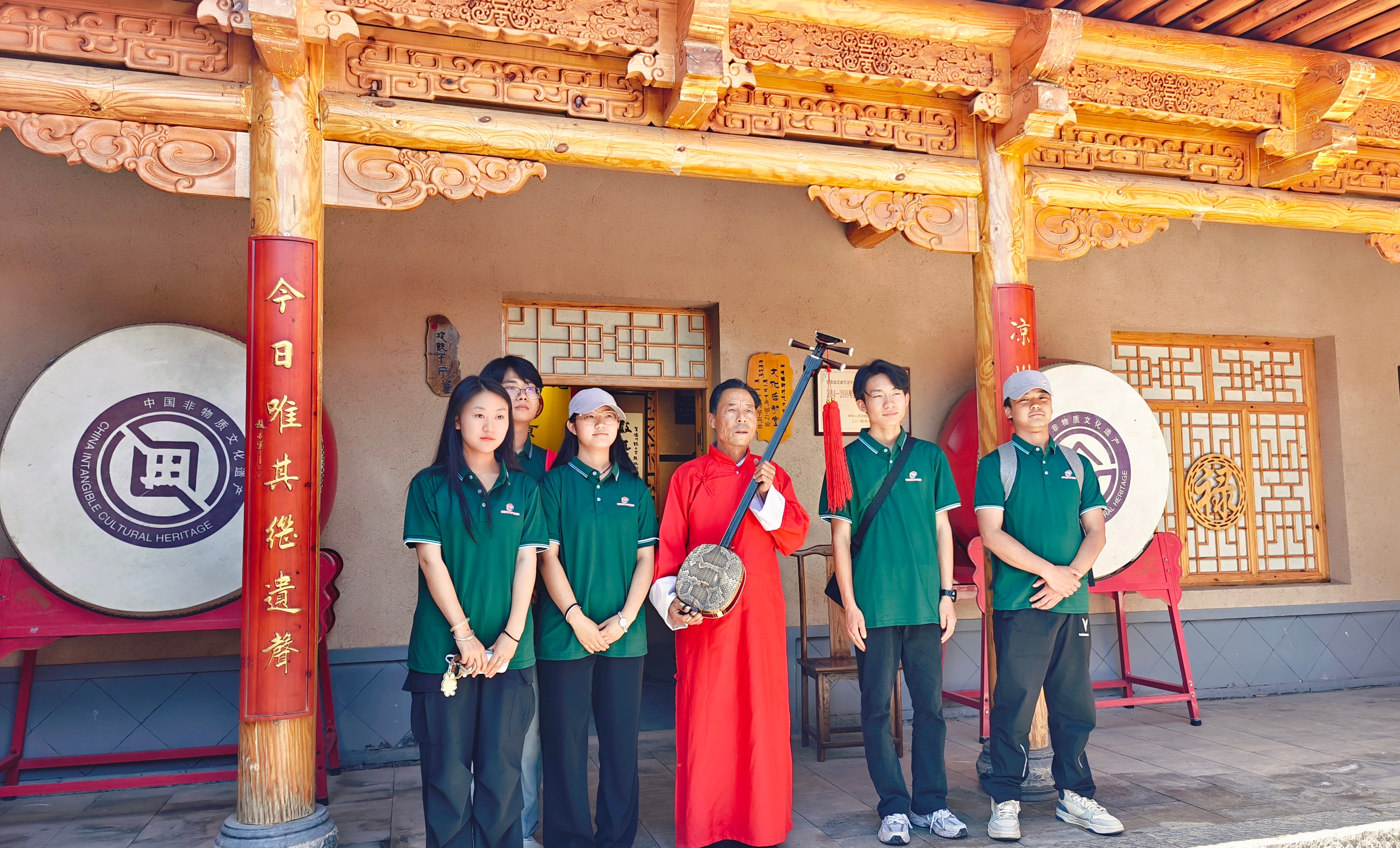 非遺民俗文化館當(dāng)天化身成為一座流動的非遺課堂,實(shí)踐團(tuán)成員們圍坐在古樸的庭院中,聚精會神地聆聽當(dāng)?shù)刭Y深賢孝藝人董永虎老師深情演繹的經(jīng)典曲目。老藝人蒼勁而富有穿透力的嗓音,伴著三弦琴弦的顫動,將一段段蘊(yùn)含忠孝節(jié)義、勸人向善的古老故事娓娓道來。那飽經(jīng)歲月洗禮的曲調(diào),仿佛穿越時空,在青磚黛瓦間回蕩,讓在場的每一位學(xué)子都深深沉浸其中,體味著這門古老說唱藝術(shù)所承載的歷史重量與人文溫度。