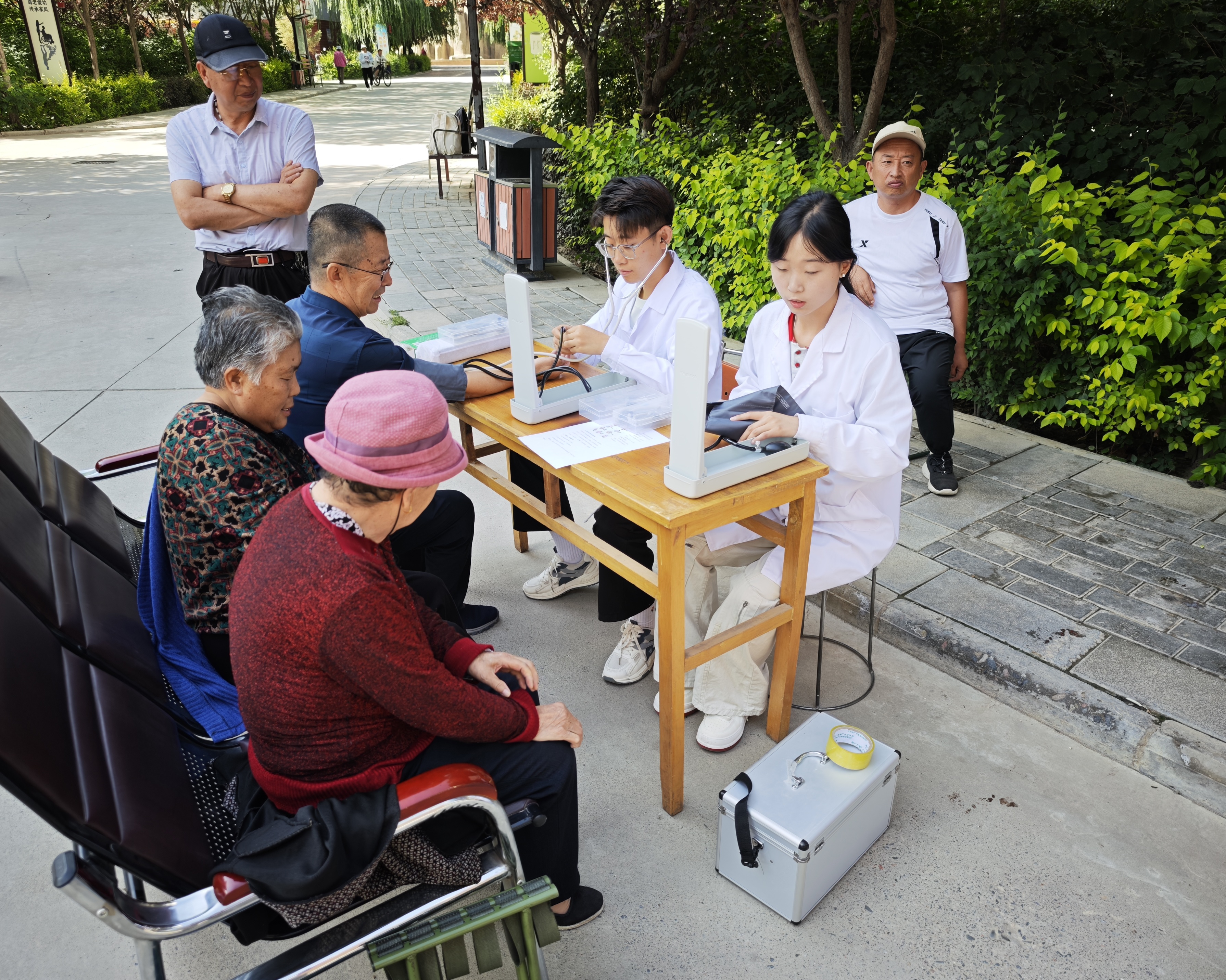在指導(dǎo)老師的帶領(lǐng)下,志愿者們走進(jìn)武威市涼州區(qū)窯溝村,他們手持血壓計(jì)為村民細(xì)心測(cè)量,指尖傳遞著溫暖的守護(hù)。針對(duì)常見的高血壓問題,志愿者們將書本的醫(yī)學(xué)知識(shí)化作“少鹽多醋常走動(dòng)”的貼心叮嚀;艾灸棒在老人膝蓋處揮舞,老人們微闔雙眼,皺紋間舒展開寧靜的笑意。志愿者精心準(zhǔn)備了蘊(yùn)含中藥智慧的五色香囊,讓預(yù)防保健的種子在老人們心中生根發(fā)芽。